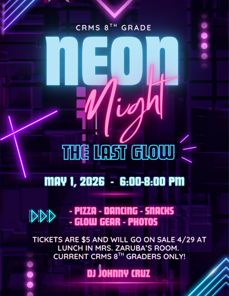 El baile semiformal de 8.º curso se acerca rápidamente: tendrá lugar el viernes 1 de mayo. Este evento es muy divertido cada año y nos encanta ver cómo se lo pasan en grande los alumnos de 8.º curso. Dicho esto, sé que muchos de vosotros ya estáis echando una mano o os habéis puesto en contacto recientemente para preguntar qué más necesitamos. Aquí tenéis un enlace a la lista de deseos de Amazon con las cosas que aún necesitamos; podéis enviárselas a vuestra dirección y que vuestro hijo o hija las traiga al colegio, o bien enviarlas directamente al colegio a la dirección: 6201 Booth Dr., Firestone, CO 80504.